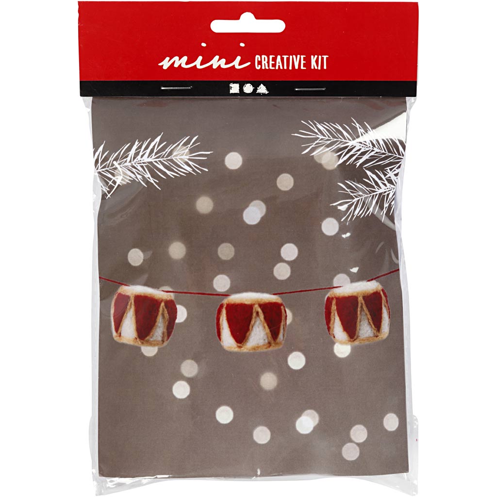Starta upp julen och kreativiteten med detta materialset som innehå¨ller material till att göra en girlang med tre nålfiltade trummor i tradtionella julfärger. Med den medföljande beskrivningen kommer du snabbt i gång