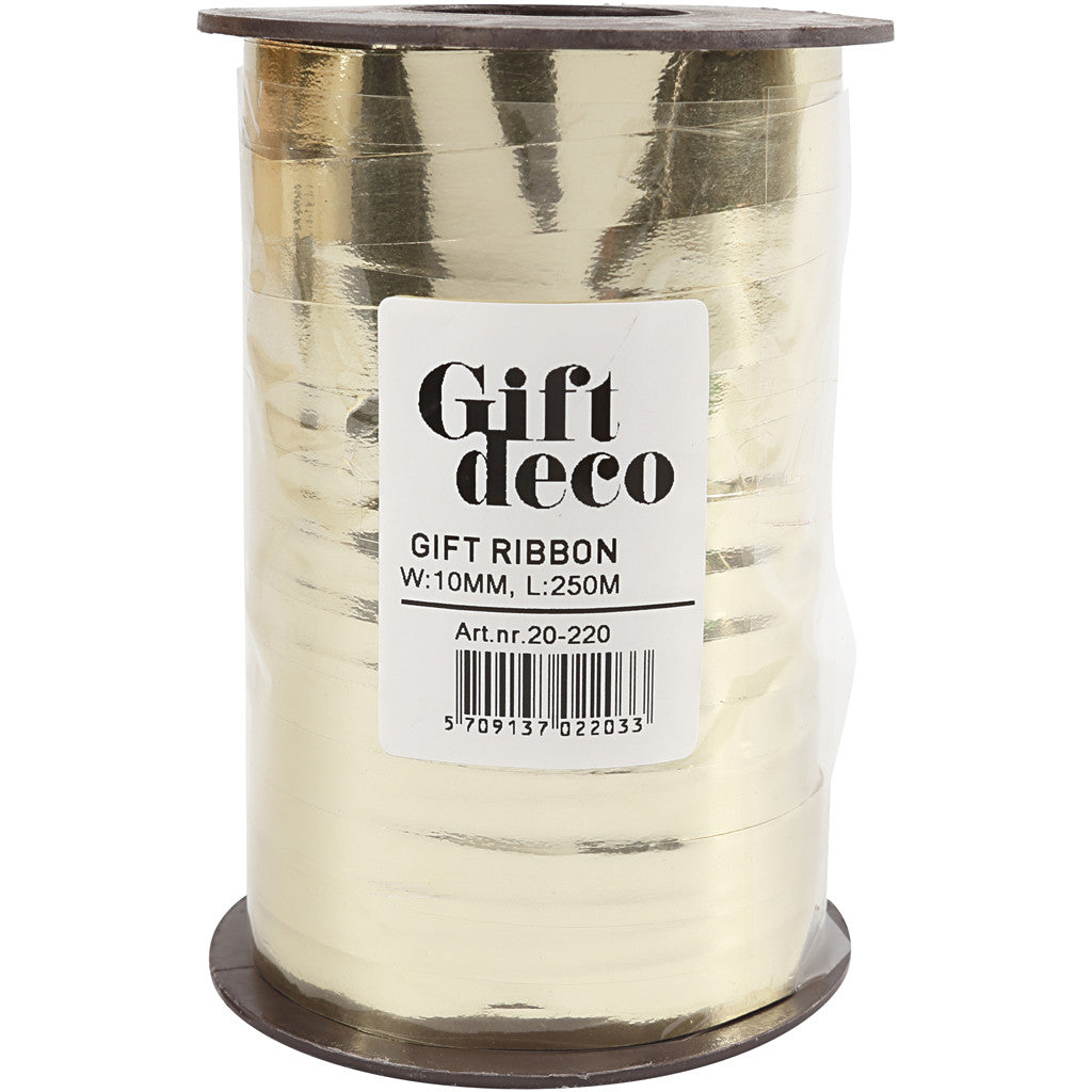 Presentsnöre, B: 10 mm, blank, metallguld, 250 m/ 1 rl. [HOB-20220]