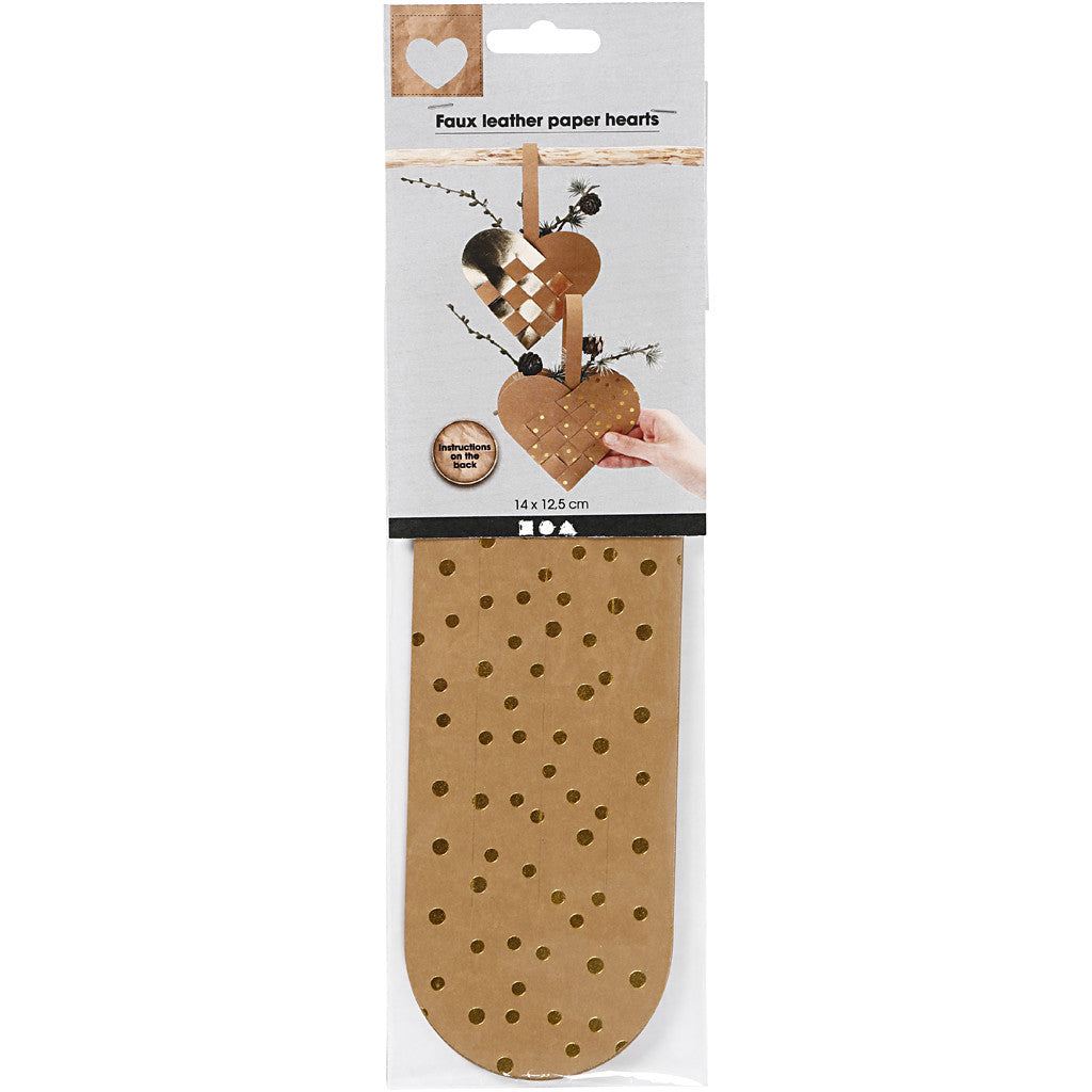 Materialset med utstansade delar till 4 flätade hjärtan i tre designer som ev. kan mixas. Inkl. handtag i natur. Innehåller: utstansade hjärtschabloner till 2 hjärtan i natur, 1 hjärta i guld och 1 hjärta i natur med guldtryck samt 4 handtag Beskrivning medföljer