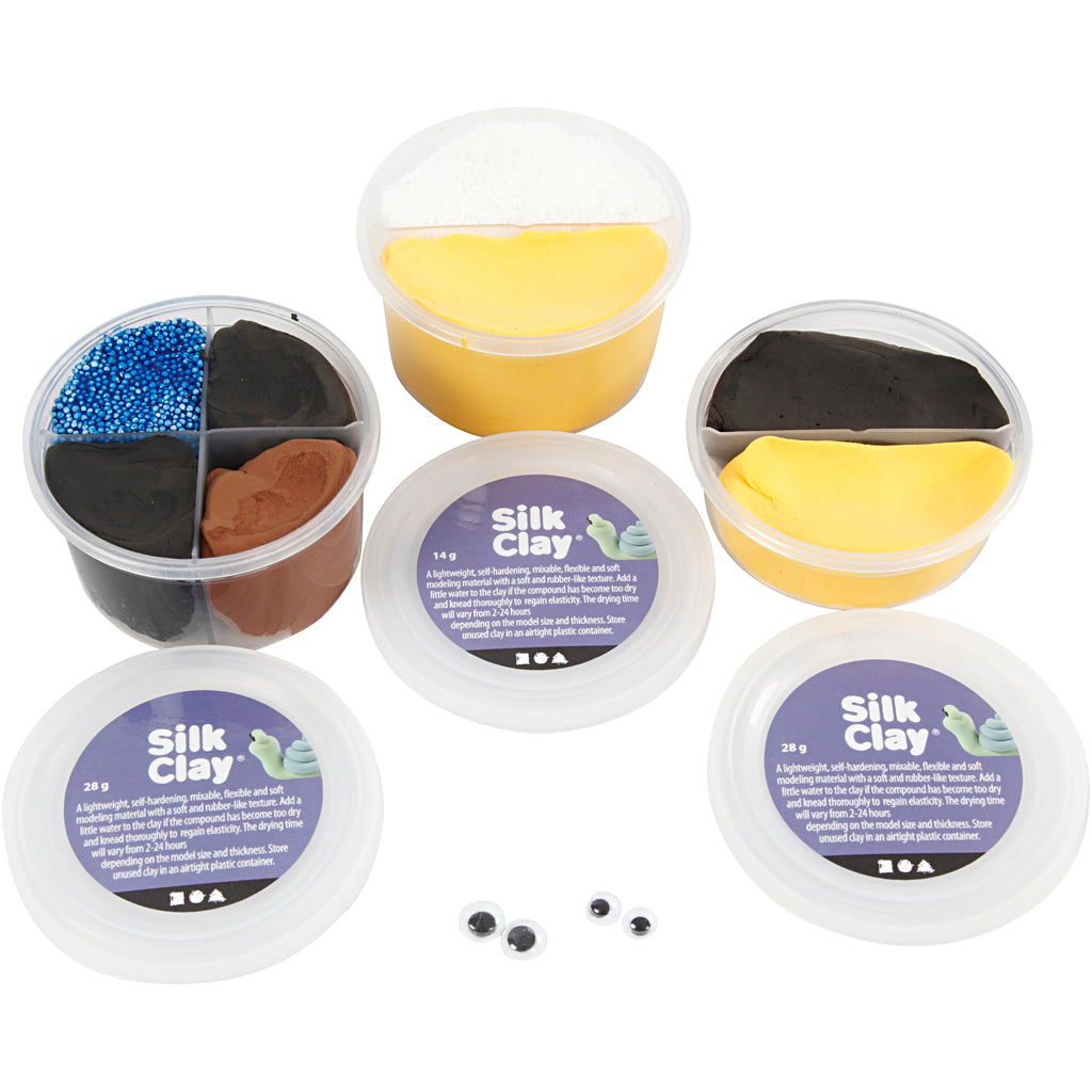 Materialset till modellering av fingerdockor av Fåret Shaun och Bitzer i Silk Clay och Foam Clay. Beskrivning medföljer.