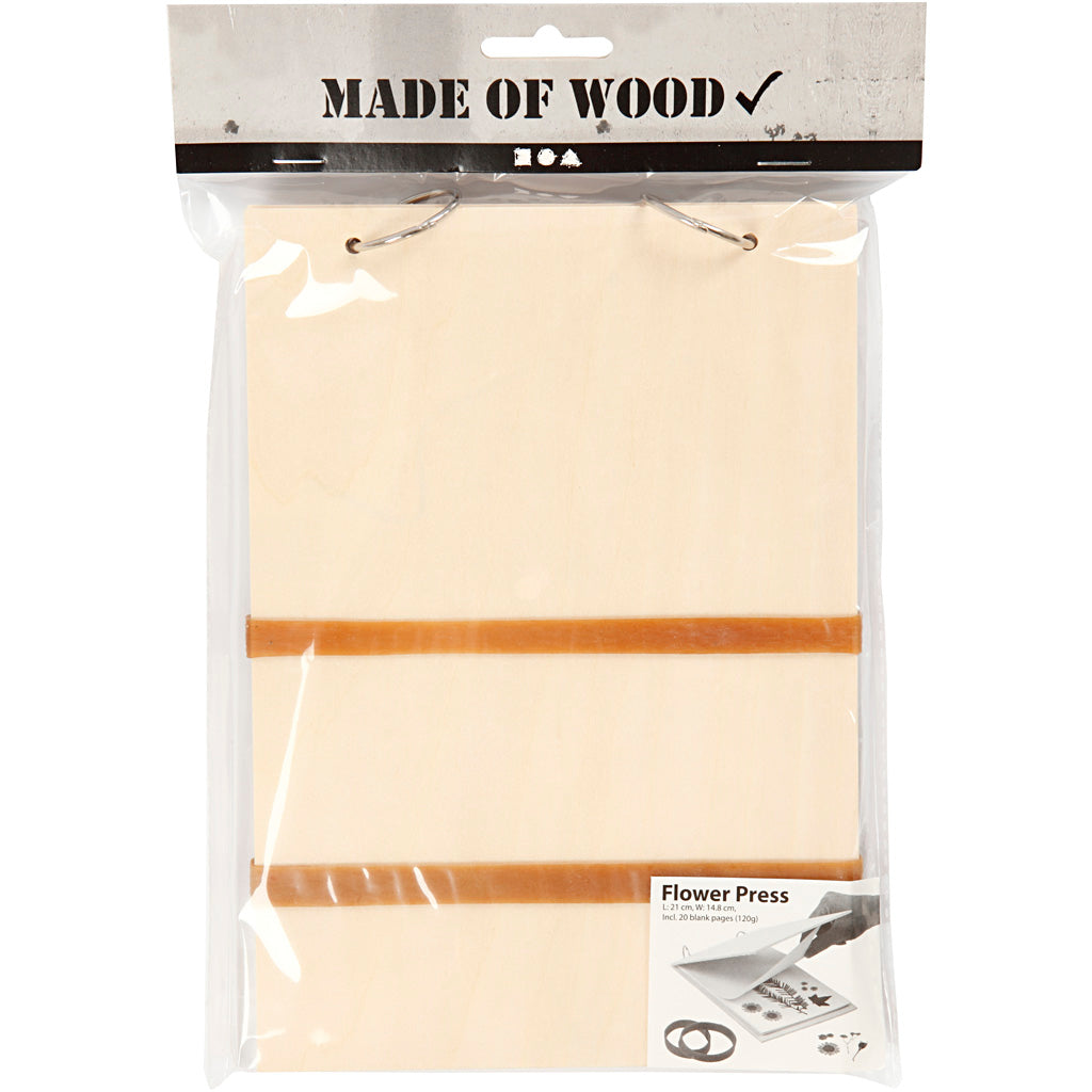 Blomsterpress med omslag i ljust trä med återförslutbara metallringar och 20 blanka sidor (120 g). Det medföljer 2 breda elastiska band som placeras runt omslaget för att få extra tryck