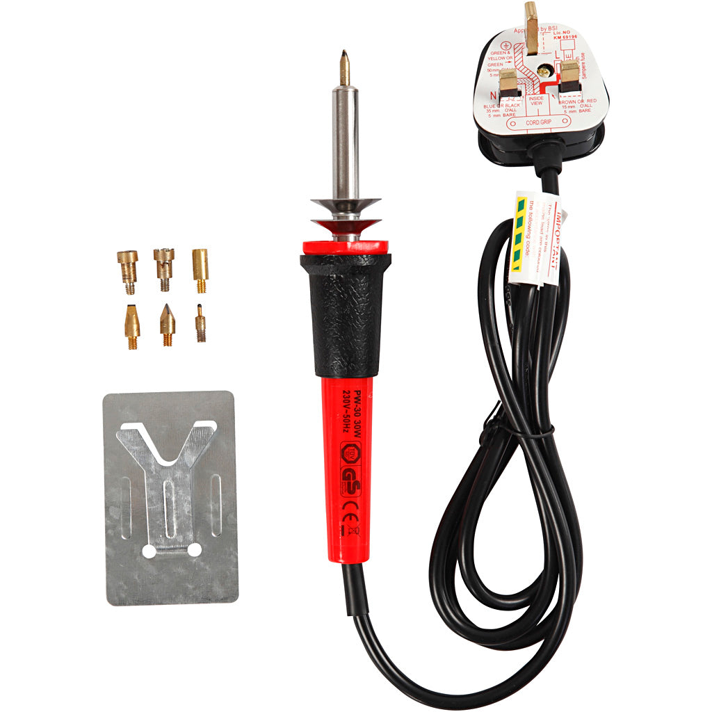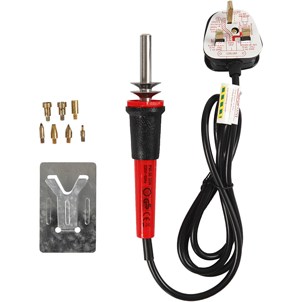 Elektriskt verktyg med utbytbar spets av metall för prägling/bränning i kork, läder och trä. Hållare och ppets medföljer till motivavtryck och frihandsmålning/textning.