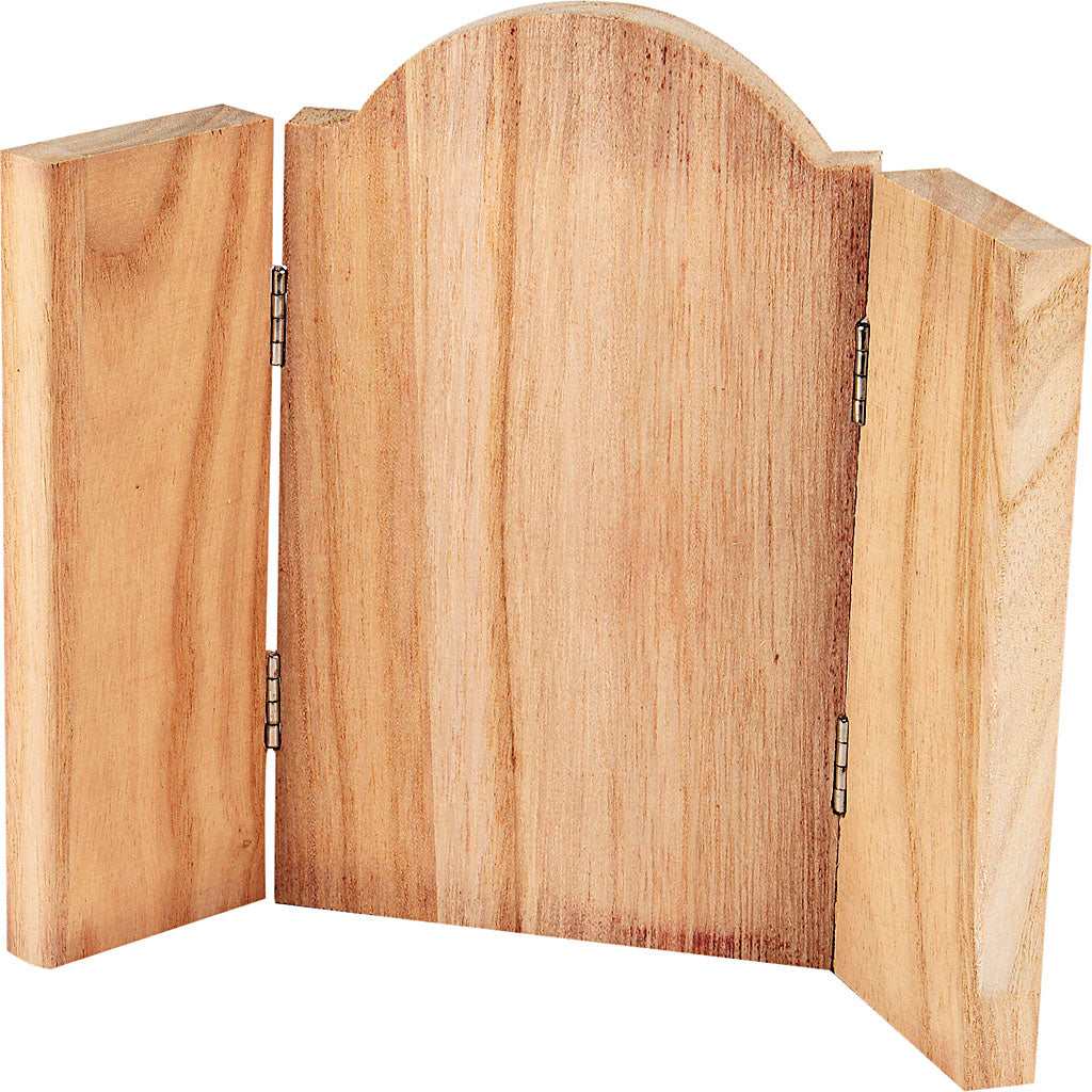 Tredelad, utskuren ikonplatta i trä med gångjärn i metall