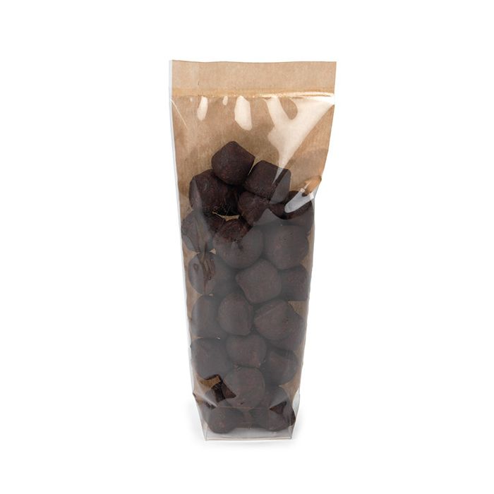 Sidofyllda påsar med platt botten och kraftbaksida är en unik och lyxig förpackning för lätta föremål som godis, nötter, frön, godismaskar med mera. FGKB20 mäter 5,1 x 4,4 x 21,6 cm, har en genomskinlig framsida för att visa föremålen och en baksida av kraftpapper. Botten har ett vitt pappersinlägg i botten av påsen för att ge extra stöd. Den här påsen är tillverkad av livsmedelssäkert 85-mikron-material och kan förslutas. Lämplig för produkter på 226 gram.