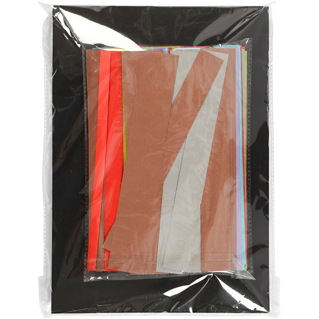 Klasset med svarta och vita vävramar i kraftig kartong med utstansade skåror samt vävstrimlor i tvåfärgade, tryckta papper i många olika, klara färger och varierade bredder. Innehåller: 50 vävramar och 960 st. dubbeltryckta vävstrimlor i 4 bredder i 20 färger.