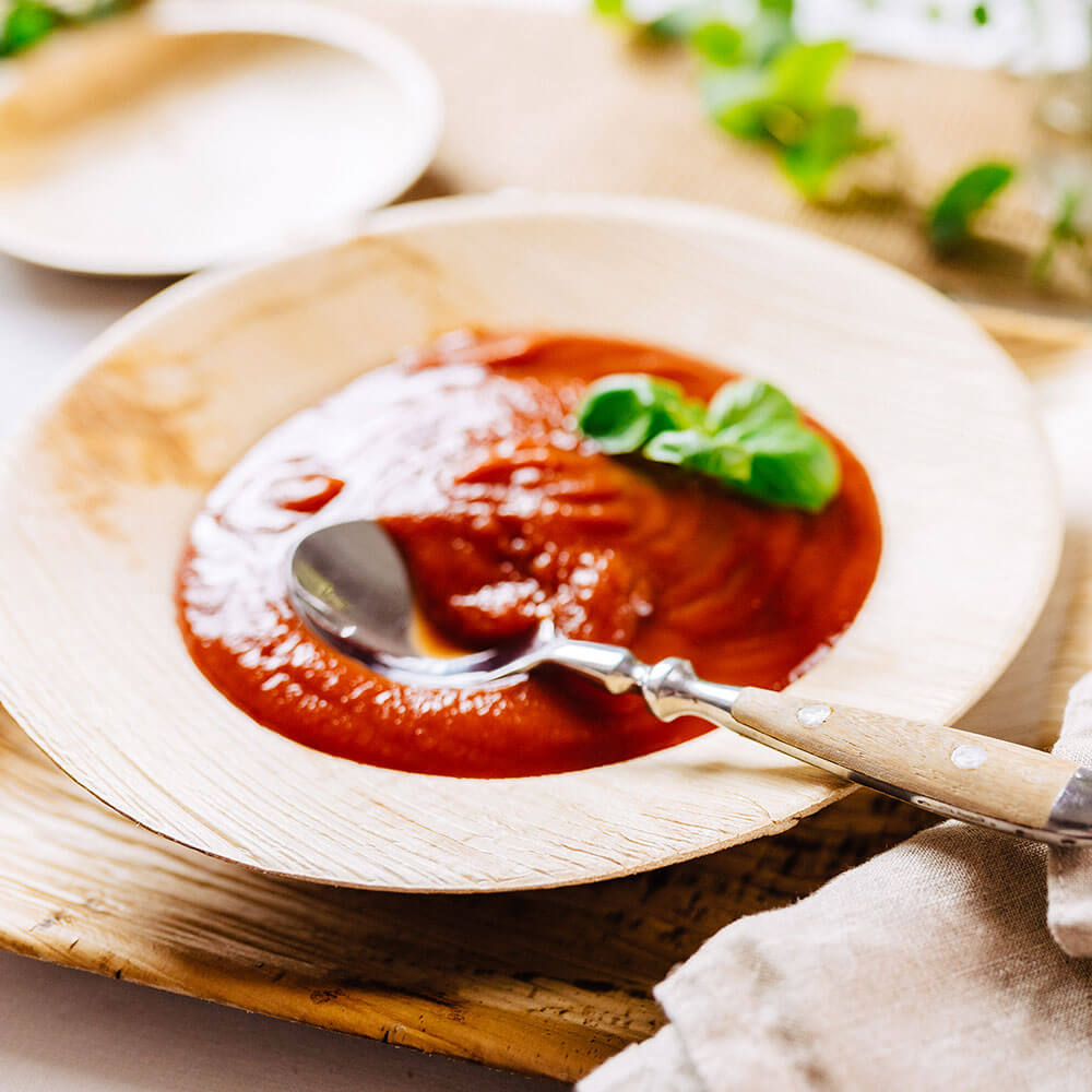 Palmbladtallrikar är ett naturligt sätt att presentera produkter på bordet.