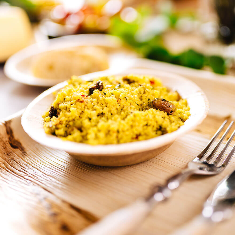 Palmbladtallrikar är ett naturligt sätt att presentera produkter på bordet.
