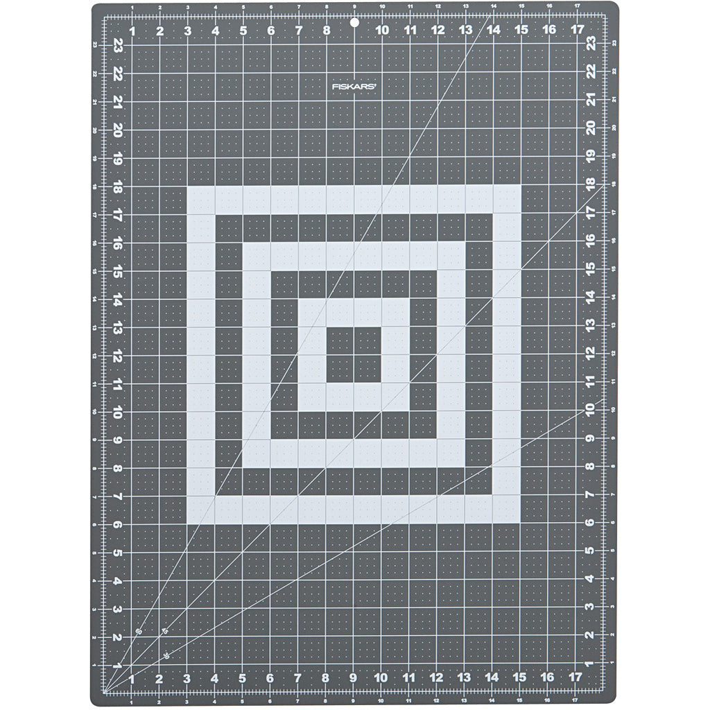 Hållbar, vändbar skärmatta från Fiskars i "selfhealing" kvalitet med påtryckta hjälplinjer i tum och cm samt vinkellinjer