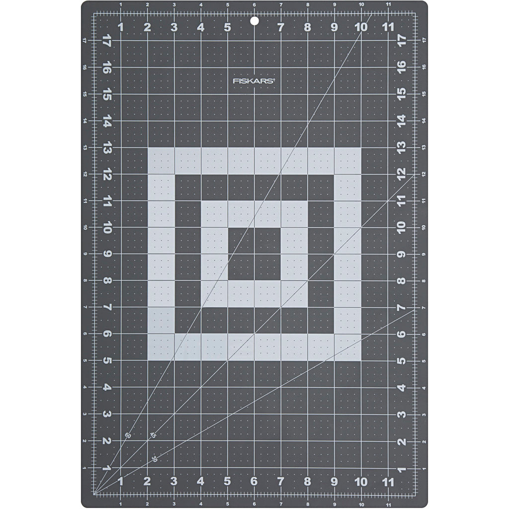 Hållbar, vändbar skärmatta från Fiskars i "selfhealing" kvalitet med påtryckta hjälplinjer i tum och cm samt vinkellinjer