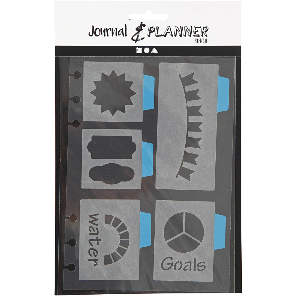 Självhäftande, non-permanent schablon av plast med olika figurer och motiv som är perfekt till bullet journal. Levereras på akrylark med hål som kan sättas in och passar till planner artnr. 192648-651. Tvättas av direkt med ljummet vatten