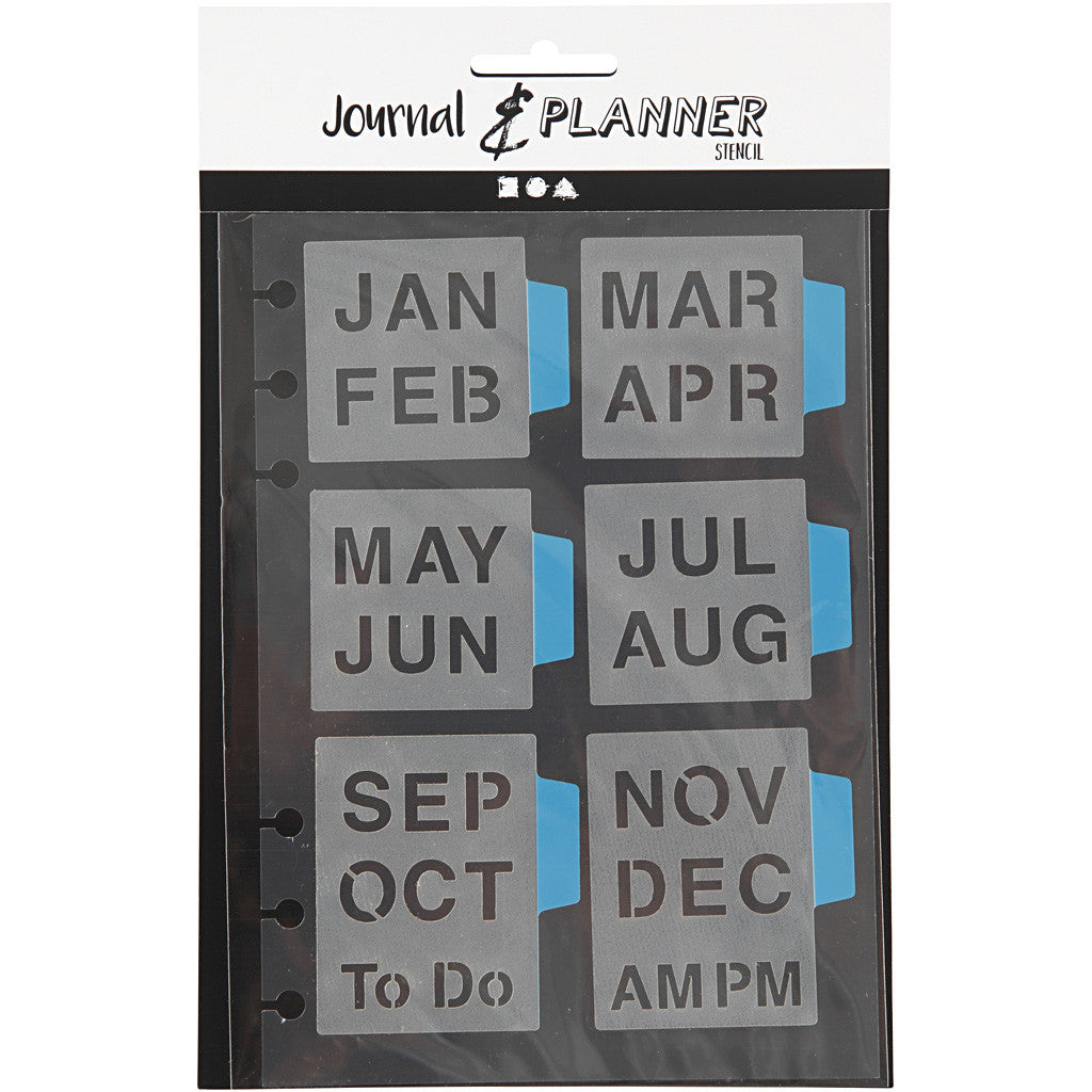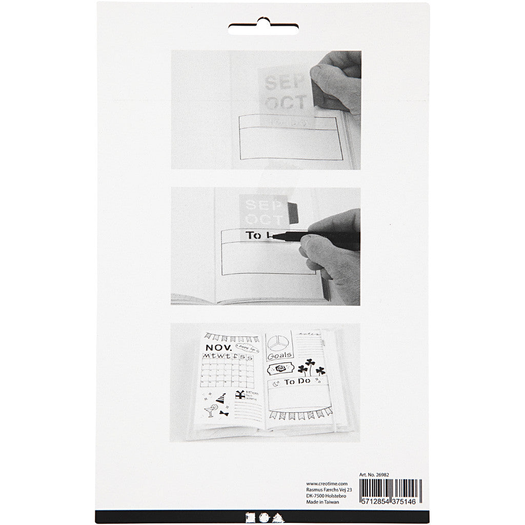 Självhäftande, non-permanent schablon av plast med olika figurer och motiv som är perfekt till bullet journal. Levereras på akrylark med hål som kan sättas in och passar till planner artnr. 192648-651. Tvättas av direkt med ljummet vatten